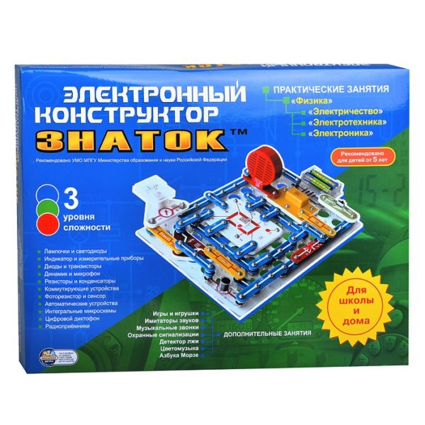 Книга с описанием 999 схем для дополнительных занятий. Полностью цветное руководство пользователя. Легкое соединение деталей. В конструкторе использована ударопрочная, экологически чистая пластмасса, надежные соединительные элементы, самые современные электронные компоненты.