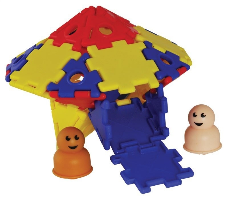 Комплектация: 45 треугольников, 45 треугольников с отверстиями, 90 квадратов, 90 квадратов с отверстиями, 36 колец, 12 колёс, 18 осей, 18 детских фигурок и 18 фигурок взрослых.