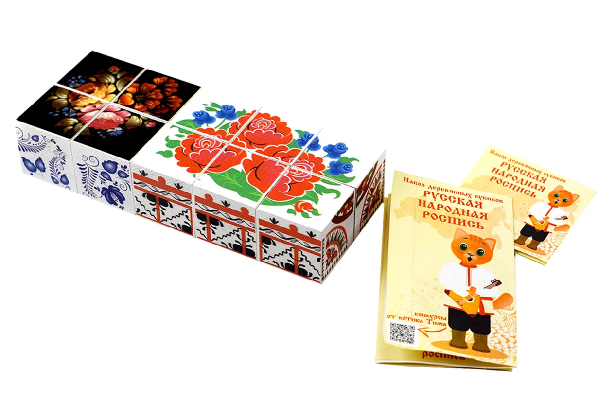 В состав Набора деревянных кубиков РУССКАЯ НАРОДНАЯ РОСПИСЬ.ПРОМЫСЛЫ. входят 2 комплекта по 4 и 6 кубиков, рассчитанных на разный возраст детей с поэтапным усложнением материала. Набор оснащен наглядными материалами.