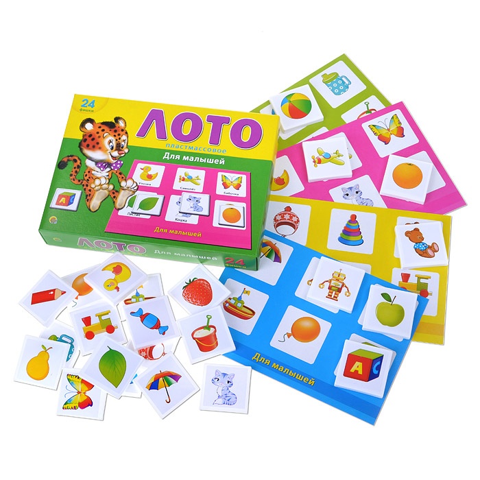 Ведущий раздает карточки лото каждому игроку. Далее он берет по одной пластмассовой карточке и называет, что на ней изображено. Если изображении на карточке у ведущего совпадает с тем, что изображено на карточке одного из игроков, игрок накрывает ею соответствующую область на карточке лото. Первый, у кого закроются все рисунки на карточке лото, становится победителем. Материал: картон, пластик.