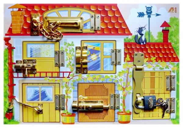 Это и щеколда с замком, и шпингалет, и крючок, и защелка и защелка на цепочке. Доска с замочками имеет общий рисунок в виде дома, у которого есть окна, двери и даже чердачное окно и дверь в пристройке.