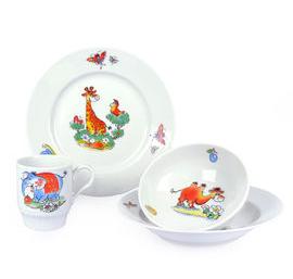 Детям непременно придется по душе этот набор посуды. Тарелочки, кружечка, ложечки и вилка рассчитаны на использование в детском саду – они имеют удобный размер для детских ручек и украшены забавными рисунками с героями сказок и мультфильмов.