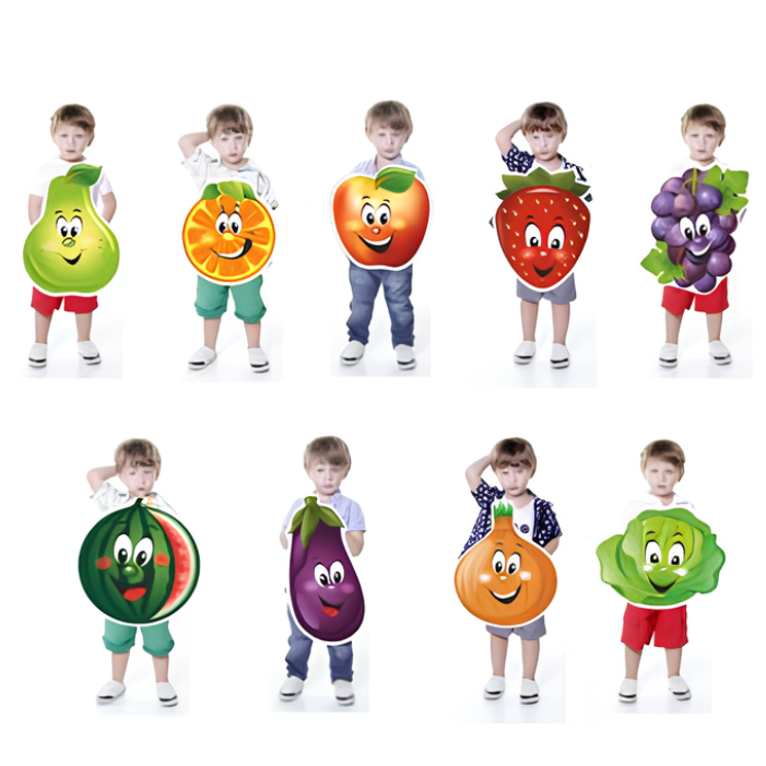 В данном наборе 9 костюмов с изображением фруктов, овощей и ягод. В набор входят: груша, апельсин, яблоко, баклажан, лук, капуста, клубника, виноград, арбуз.