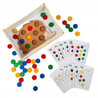 Комплектация: деревянный ежик, картонная упаковка: 14 × 4 × 20 см, 40 цветных кружков, d = 20 мм, 13 карточек с заданиями (10 карточек со счётом + 3 «повтори цвет»).