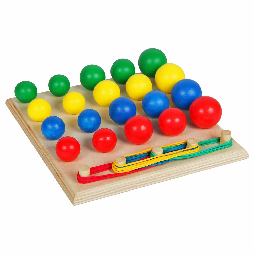 Цель игры: научиться ловко манипулировать деталями, нанизывать шарики на колышки, запомнить названия основных цветов, научиться пользоваться понятиями "большой-средний-маленький", "право-лево", "такой же-меньше-больше", освоить счет до десяти, первые математические действия.