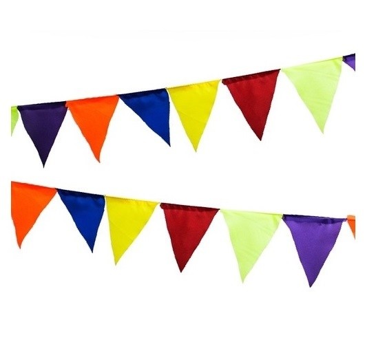 Разноцветные и яркие флажки развешаны на канатике.