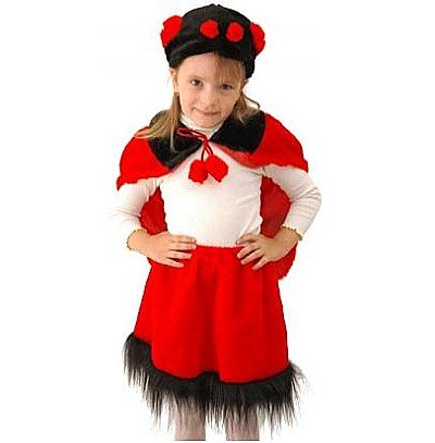 Меховой костюмчик Божья коровка состоит из шапочки, юбочки и накидки.