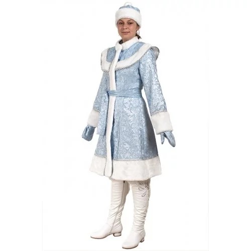 Данная модель исполнена из ткани сантун голубого цвета. Костюм выглядит празднично и красиво. Идеально подойдет для домашнего праздника или для корпоративной вечеринки.